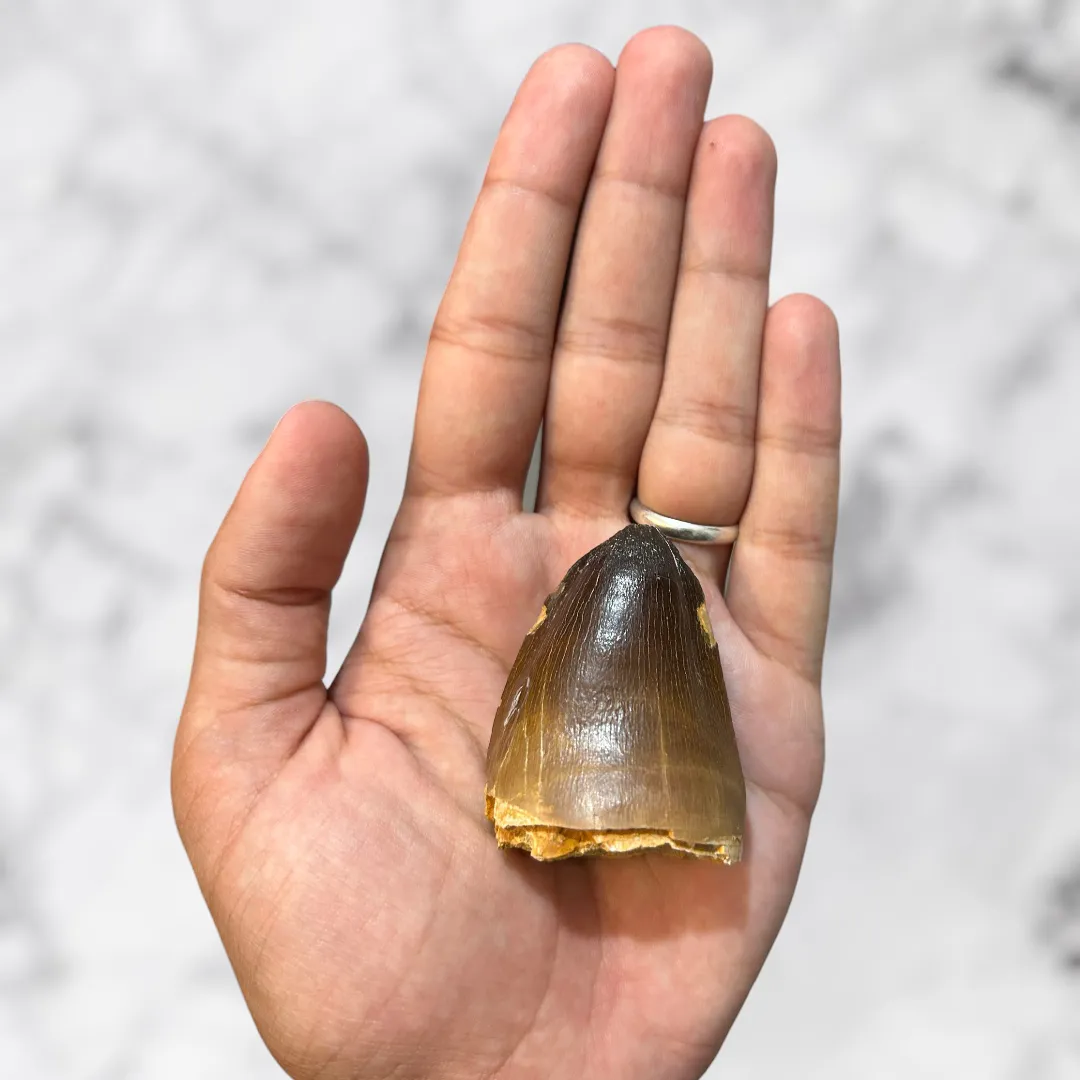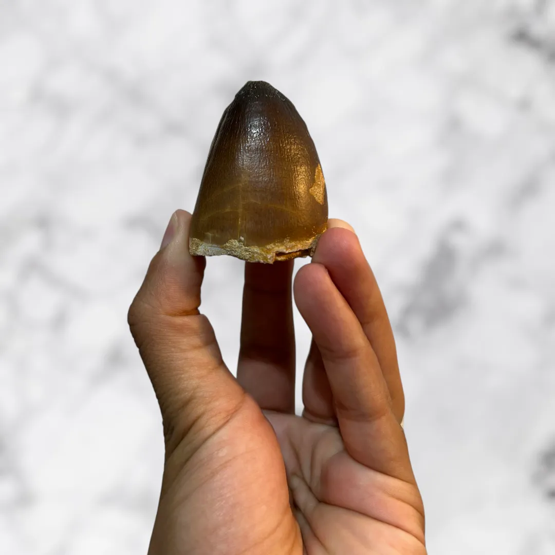 Plongez au cœur du Crétacé supérieur avec cette magnifique dent fossilisée de Mosasaure curri ?, l’un des plus grands prédateurs marins de son époque.