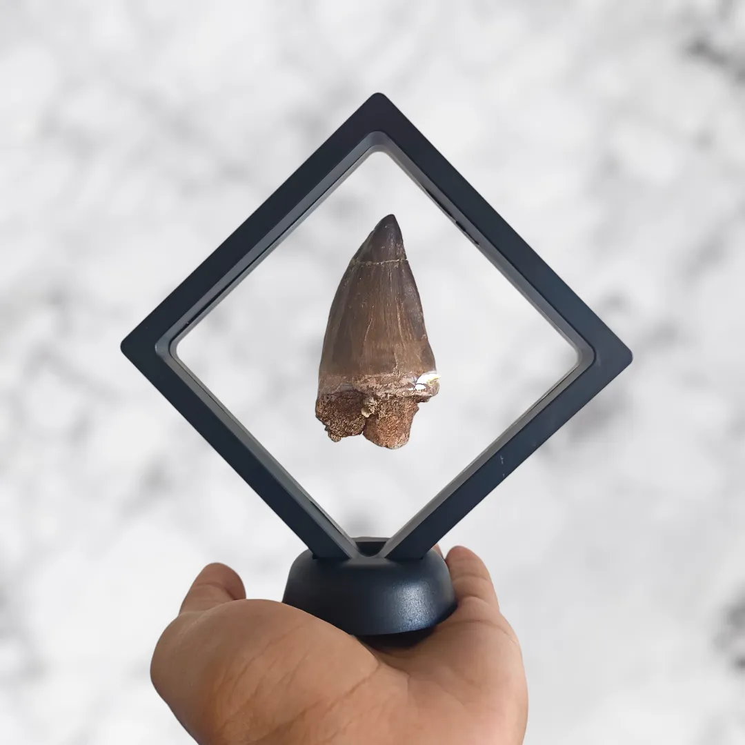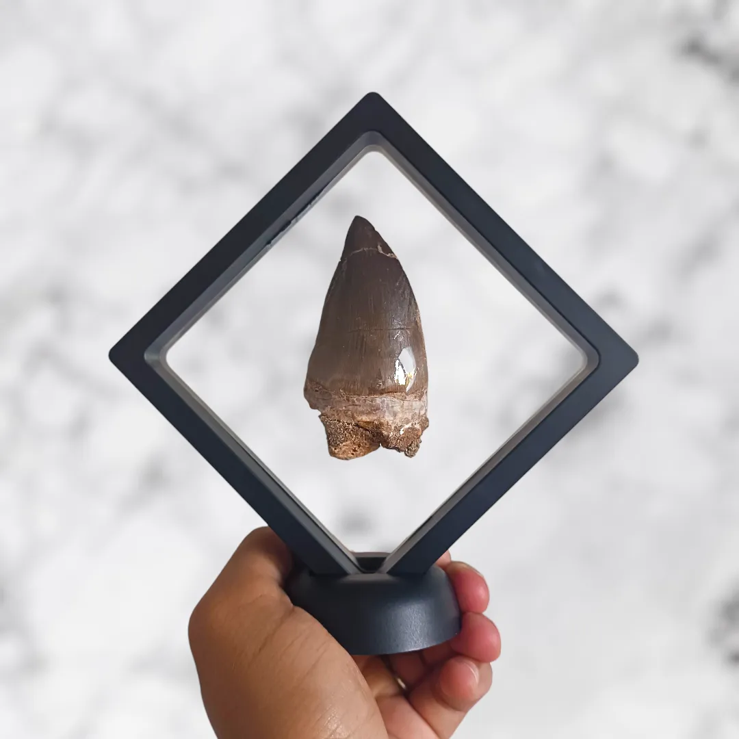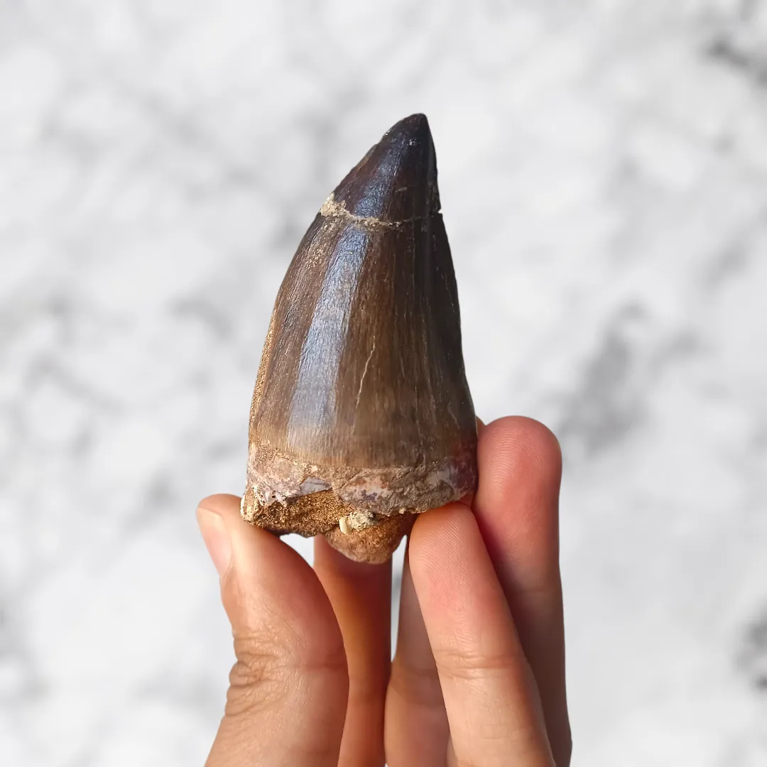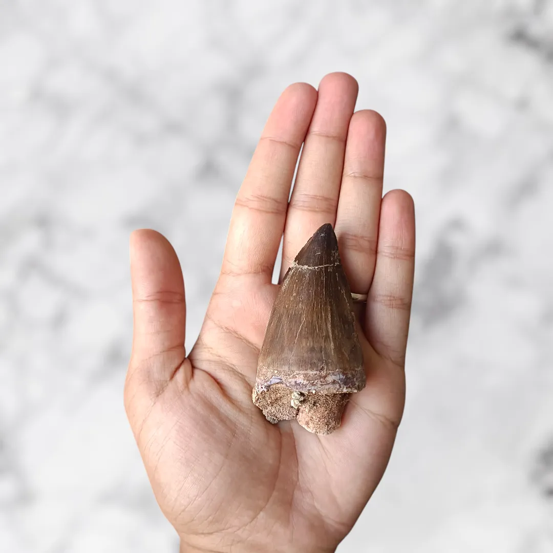 Imposante et parfaitement conservée, cette dent de mosasaure appartient au redoutable genre Prognathodon, un prédateur marin qui régnait sur les océans du Crétacé supérieur, il y a environ 70 millions d’années. Avec ses 7,2 cm de longueur, elle témoigne de la puissance de ces reptiles marins, capables de broyer coquillages et os grâce à leur mâchoire redoutable.