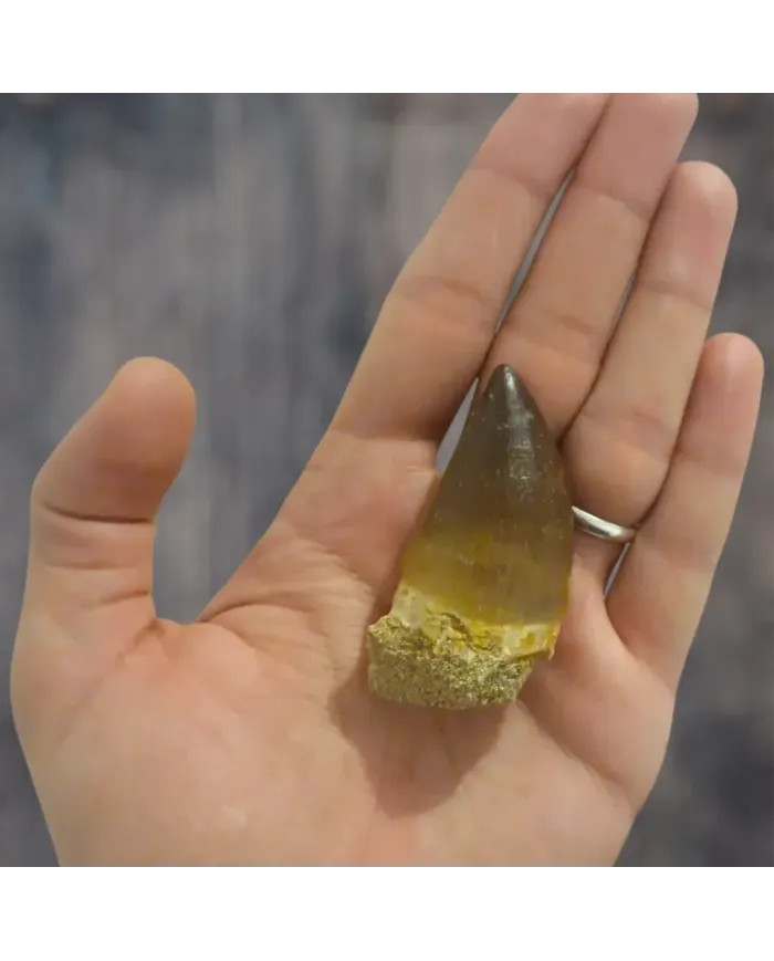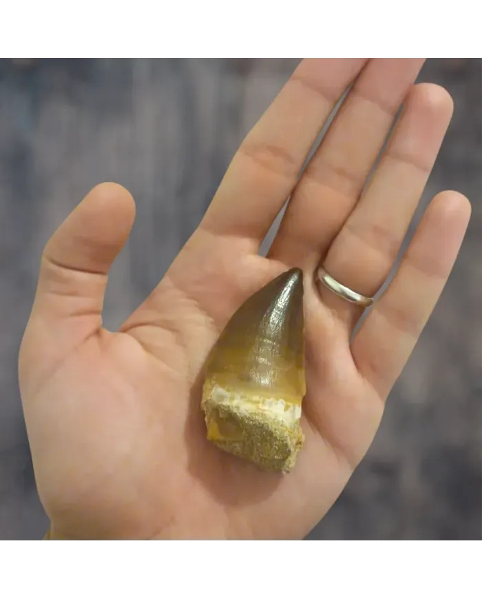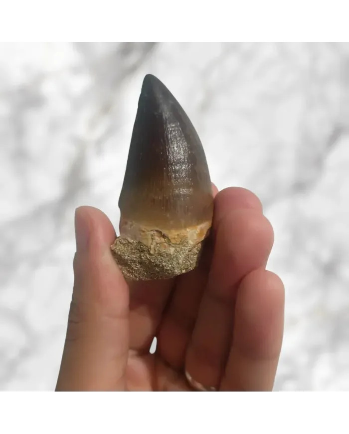 Cette magnifique dent fossile de Prognathodon anceps mesure 5,4 cm de long, 2,8 cm de large et 2,2 cm d’épaisseur. Elle se distingue par son excellent état de conservation, sans aucune réparation ni restauration, offrant un aperçu authentique de la puissance de l’un des plus redoutables prédateurs marins de la préhistoire.