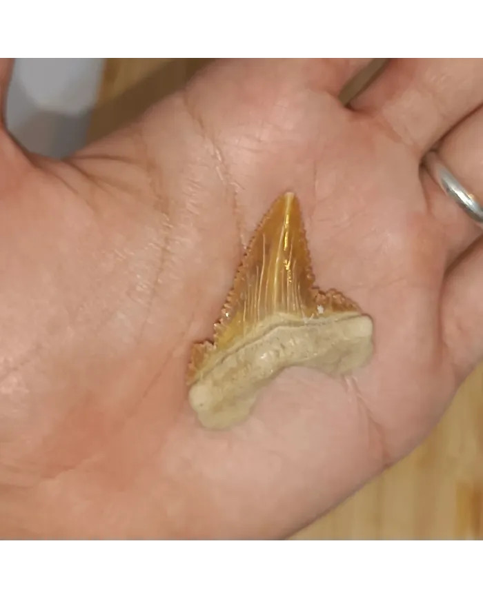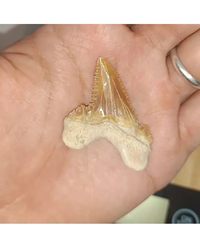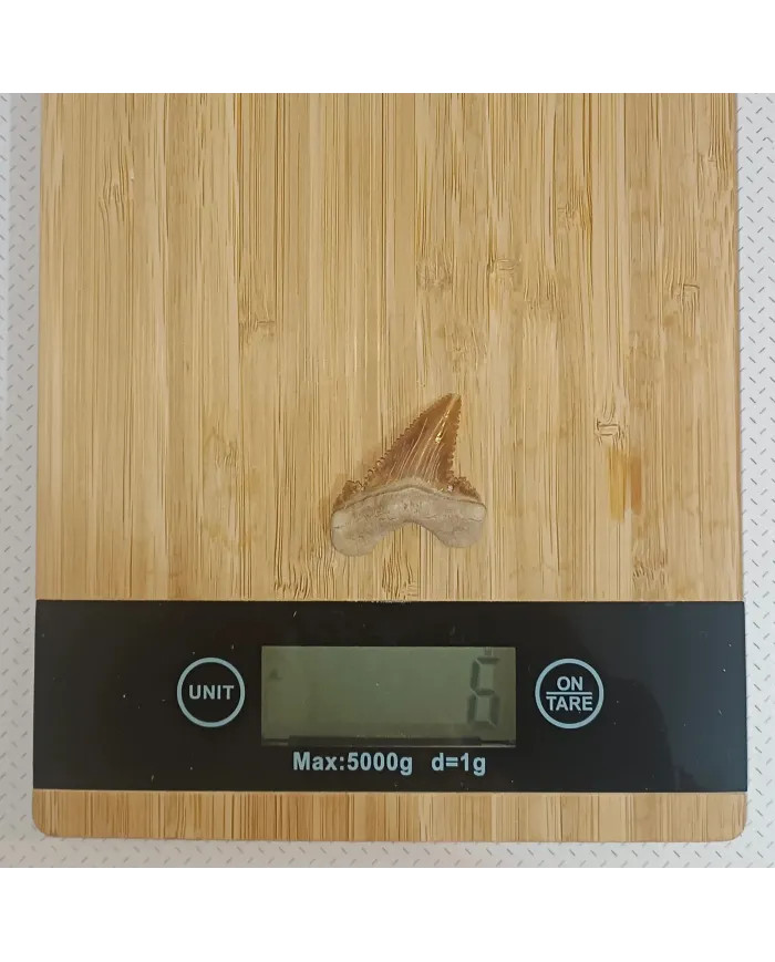 - Épaisseur : 0,6 cm, soulignant une structure robuste mais relativement fine pour une dent fossilisée.