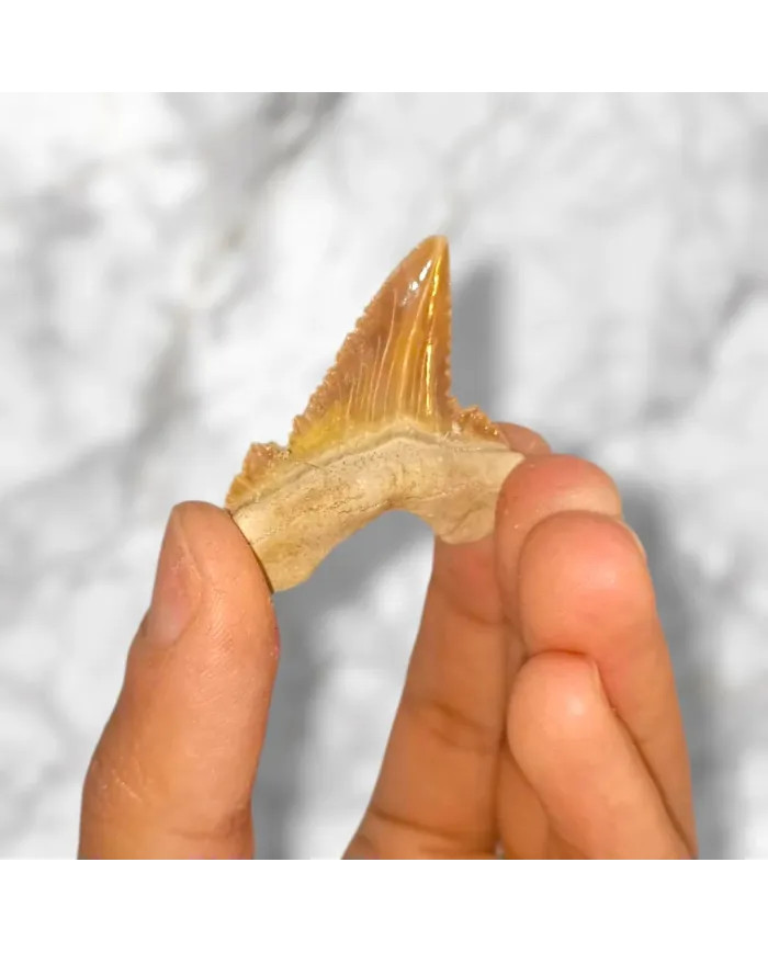 La dent de Palaeocarcharodon orientalis présente une forme triangulaire classique, avec une pointe centrale acérée et des bords finement dentelés. Elle témoigne de l’efficacité prédatrice de cette espèce éteinte, optimisée pour trancher les proies avec précision.