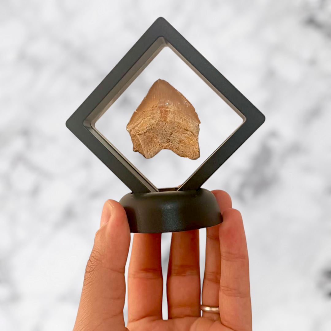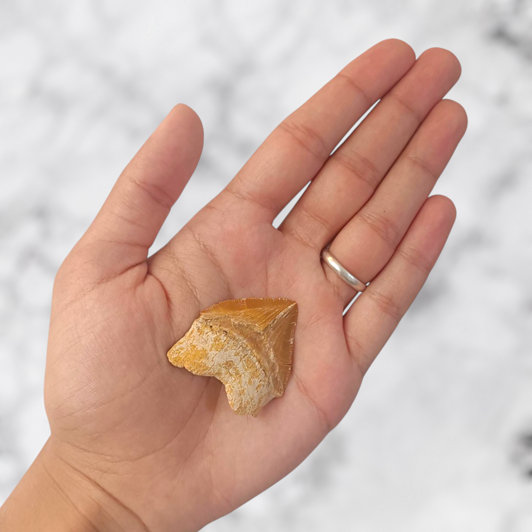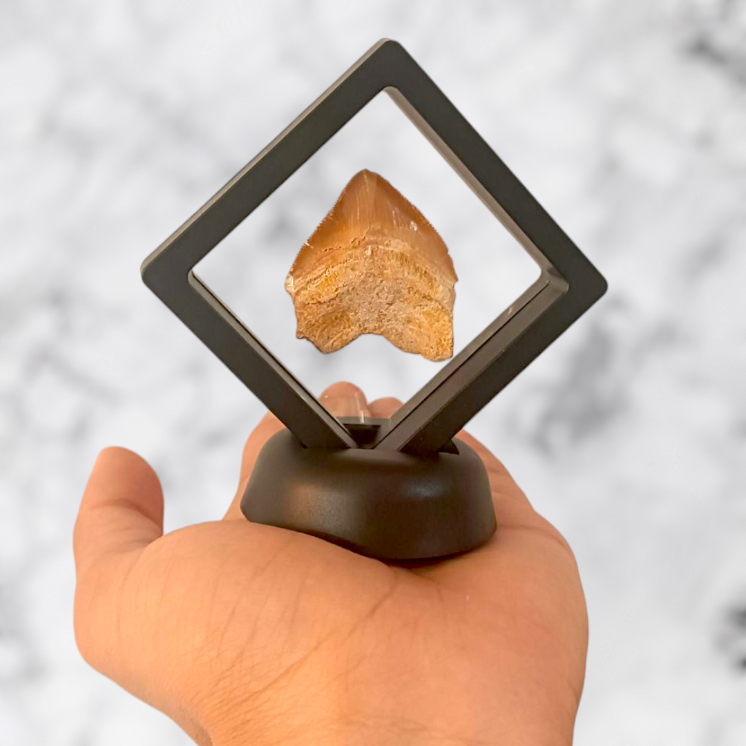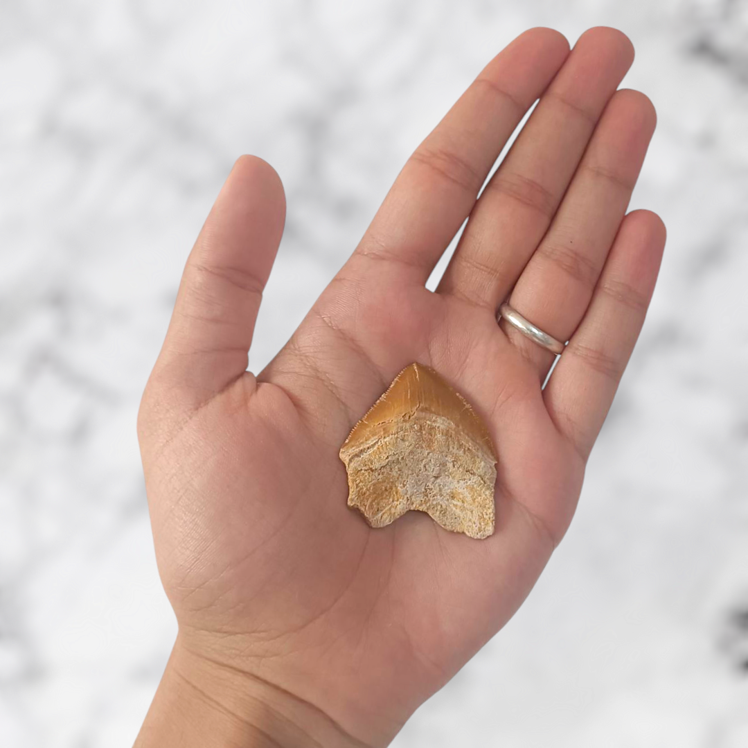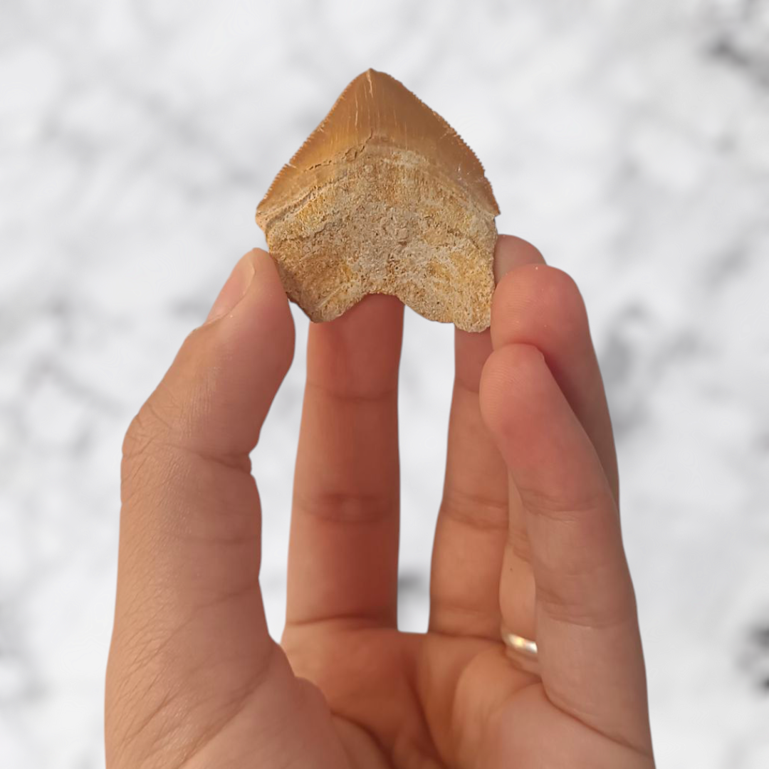 Cette dent fossilisée de requin mesure environ 4,0 cm de longueur, 3,9 cm de largeur et 0,4 cm d’épaisseur. Elle est bien conservée et présente une forme caractéristique avec des bords acérés, typiques des dents de requins. Sa couleur varie entre des teintes de brun et de gris, résultant de la minéralisation au fil du temps. La dent montre des signes d’usure sur les bords, ce qui indique qu’elle a été utilisée pour capturer et couper des proies. Ce fossile est un bel exemple de dent de requin, idéal pour les collectionneurs de fossiles marins.