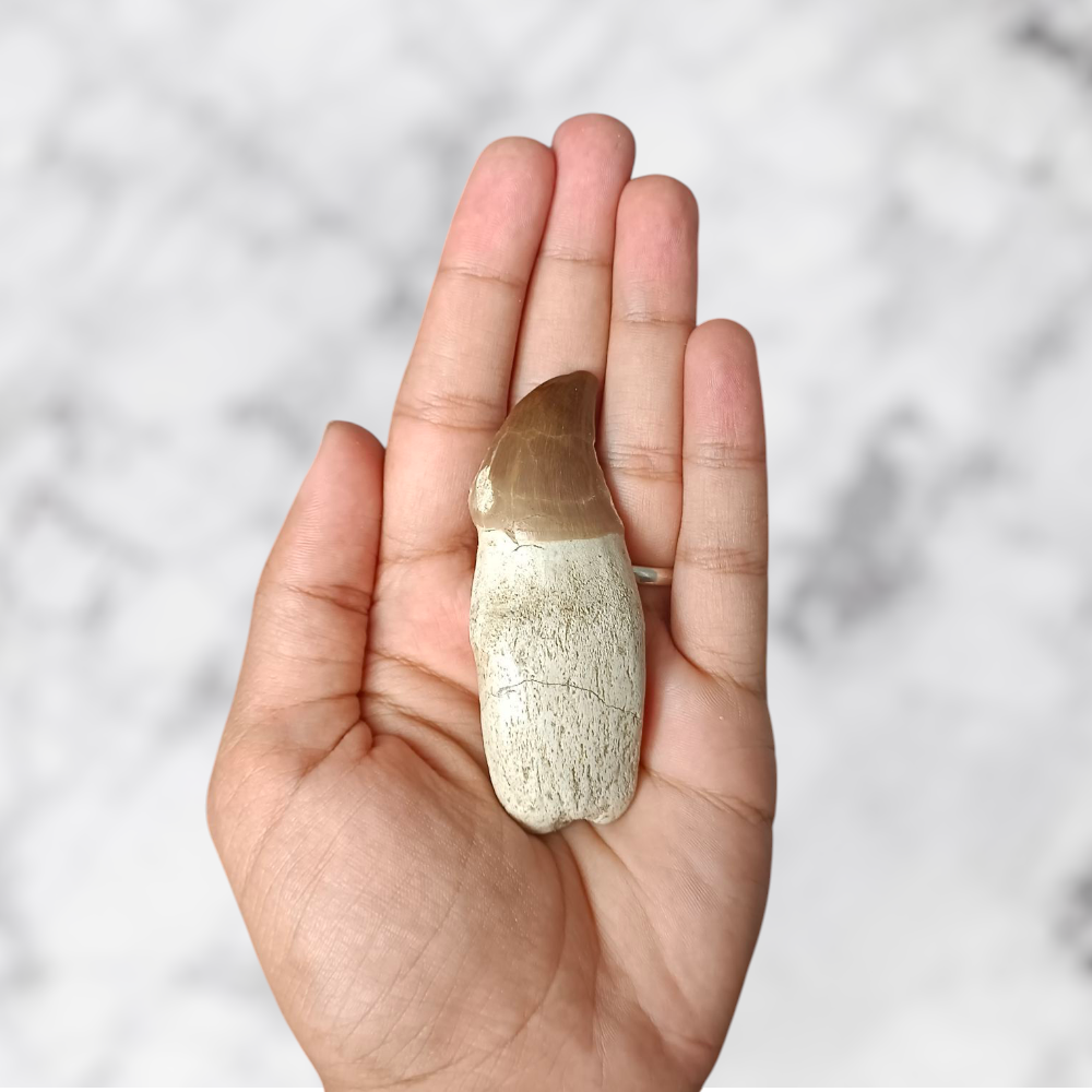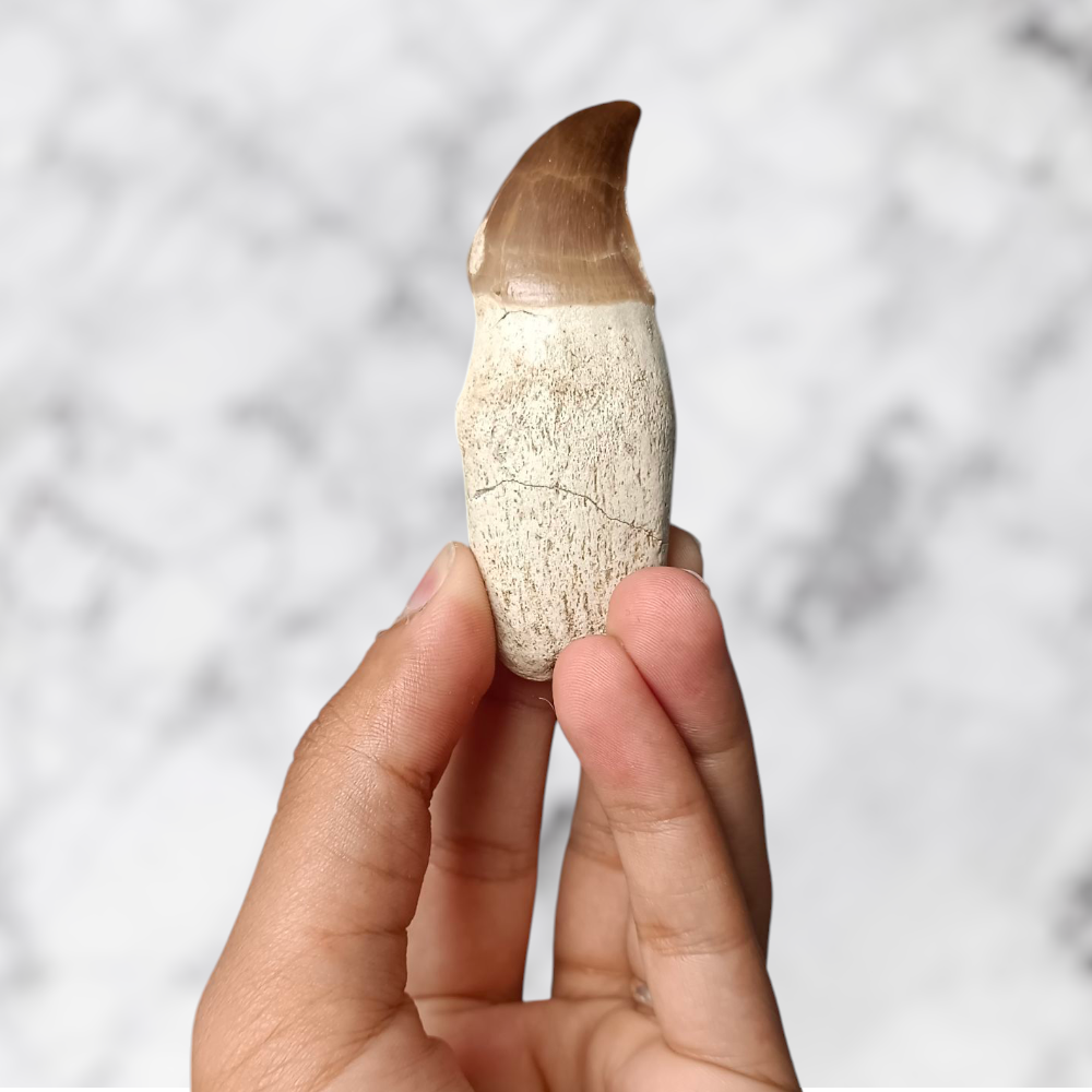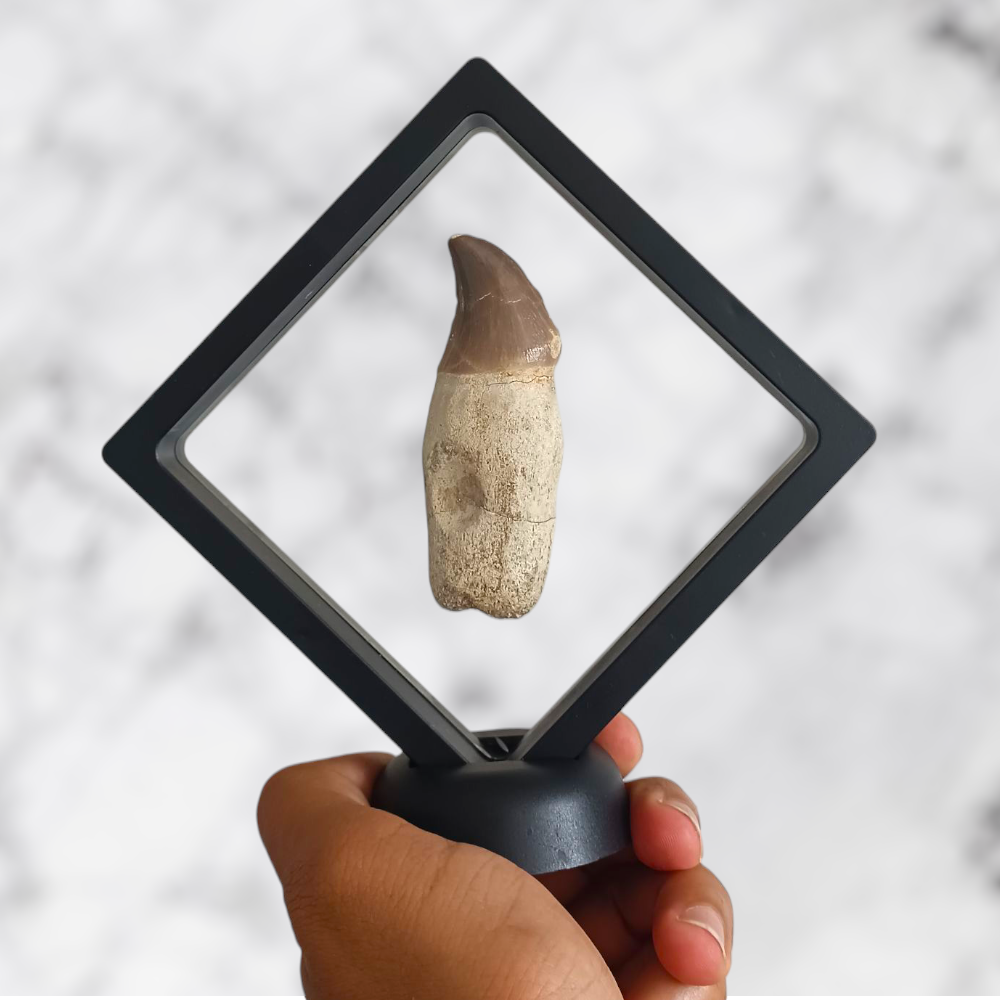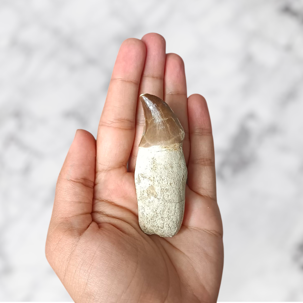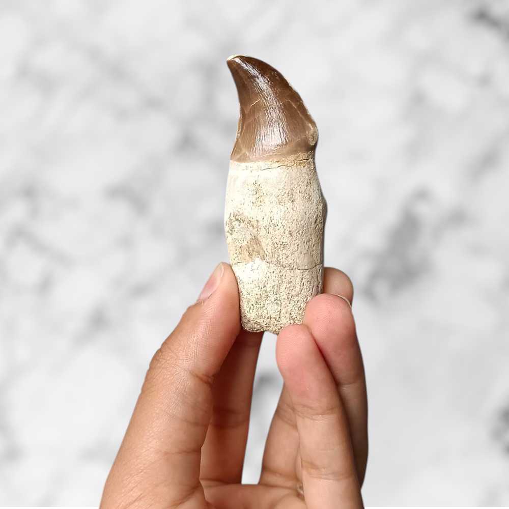 ✨ Bien que partiellement restaurée, cette dent reste 100% naturelle, conservant tout le charme de son émail brun aux reflets chauds et sa patine préhistorique unique. Chaque détail témoigne de la puissance de ces reptiles marins qui dominaient les océans il y a plus de 70 millions d’années.