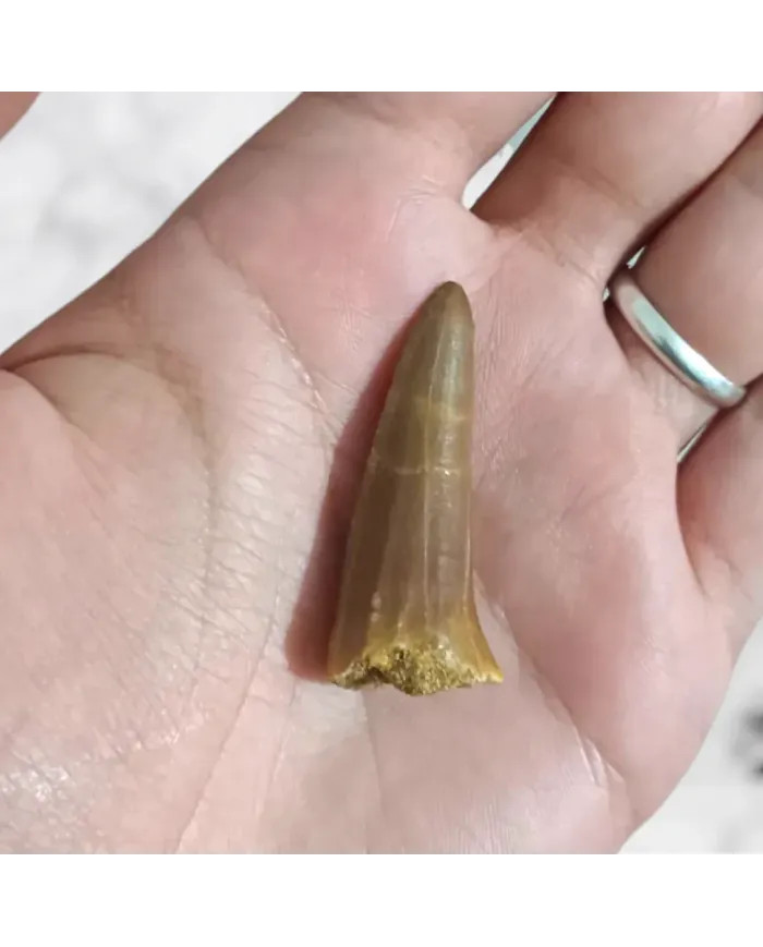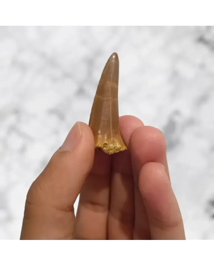 ? Cette dent fossile extrêmement rare provient de l’espèce méconnue mais fascinante Khinjaria acuta. Issue des célèbres gisements phosphatés de Khouribga, elle se distingue par sa forme courbée élégante et sa pointe acérée. Son excellent état de conservation en fait une pièce de choix pour toute collection de fossiles ?.
